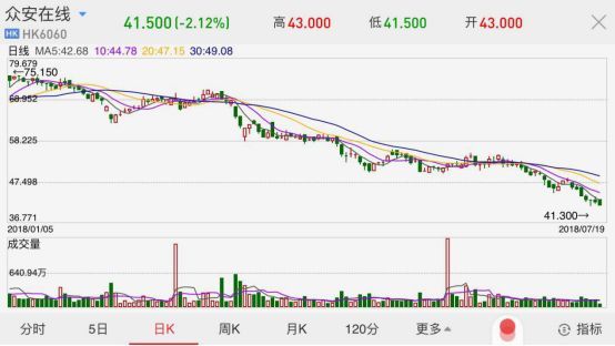 就在最近几天,集万众瞩目于一身的众安在线在资本市场上却引发不小的波澜。自7月11日至今,众安在线出六连跌,并在7月17日创下历史新低。根据同花顺提供的数据显示,昨早一开盘,众安在线便是高开低走,收盘报收41.5港元/股,成交46.57万股,成交额为1967.37万港元。