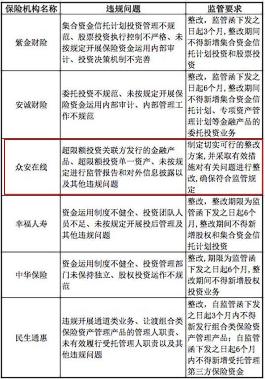 第二,6月29日中国银保监会发布的监管函中,众安在线身在其中。根据银保监会监管函显示,众安在线在险资运用上存在一些问题,主要包括:超限额投资关联方发行的金融产品、超限额投资单一资产、未按规定进行监管报告和对外信息披露等问题。